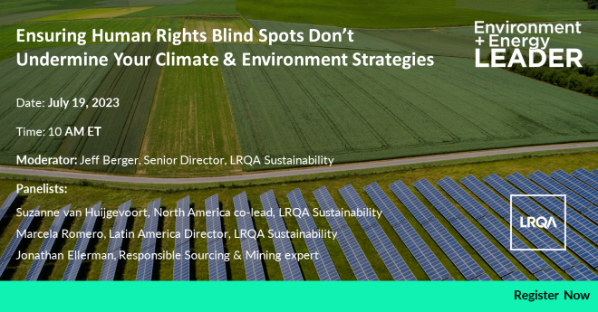 Leading companies, investors, and governments are increasingly becoming aware that achieving their climate & environment goals requires navigating and addressing thorny human rights challenges. Join Jeff Berger of LRQA Sustainability and a panel of experts as they discuss the intersection of these challenges in key areas such as critical minerals for energy technologies, recycling supply chains, and regenerative agriculture.