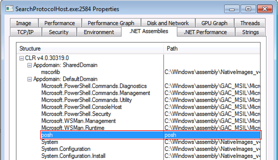For visibility, it is possible to identify if PoshC2 is running in another process by using Process Explorer which comes as part of the sysinternals suite (https://docs.microsoft.com/en-us/sysinternals/). This allows you to see if any .NET assemblies have been loaded into the running process. If the process is in fact PoshC2, there is a known Indicator of Compromise when running the CLR v4.0.30319 because you will see a DLL loaded called ‘posh’. This does not appear in .NET version two, as shown in the examples below.