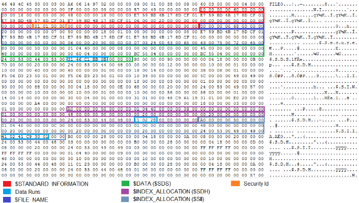 Apart from the highlighted areas related to Data Runs [14] which are part of a different attribute in each case and the Security Id that belongs to the $STANDARD_INFORMATION attribute, you’ll notice that the first 4 bytes (DWORD) represent the id of an attribute, while the second DWORD refers to the size of the attribute, including its header.