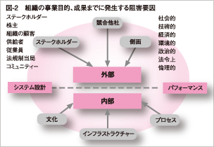 例えば、組織には「ビジネスの仕組み=システム設計」があり、そこから「成果=パフォーマンス」、例えば顧客満足や売上げの向上が生まれていきます。しかし、成果をあげるまでのプロセスの中には、様々な阻害要因があるでしょう(図-2参照)。