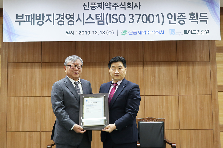 신풍제약이 지난 2019년 12월 18일 로이드인증원(LRQA)로부터 ISO 37001 인증을 획득하면서 윤리경영을 선도하는 제약업체의 반열에 올랐습니다. 이를 기념하기 위해 서울 강남에 위치한 신풍제약의 본사에서 인증수여식이 개최되었습니다.