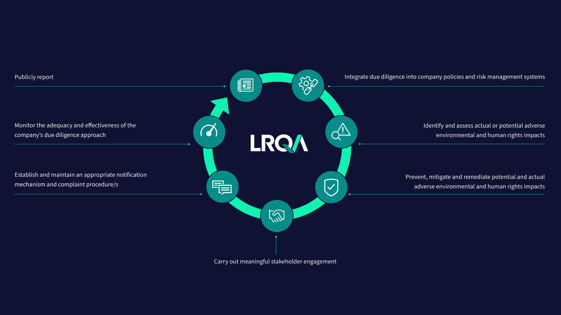 LRQA มอบบริการหลากหลายเพื่อช่วยให้ธุรกิจต่างๆ สามารถนำหลักสิทธิมนุษยชนและการตรวจสอบด้านสิ่งแวดล้อม (HREDD) ที่มีประสิทธิภาพไปปฏิบัติได้ สอดคล้องกับกฎระเบียบระดับโลกและแนวทางปฏิบัติที่ดีที่สุด เราพร้อมที่จะสนับสนุนองค์กรของคุณในทุกขั้นตอนของวงจร HREDD โดยนำเสนอแนวทางที่ครอบคลุมและมีโครงสร้างชัดเจน ซึ่งอาจรวมถึง: